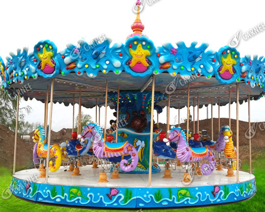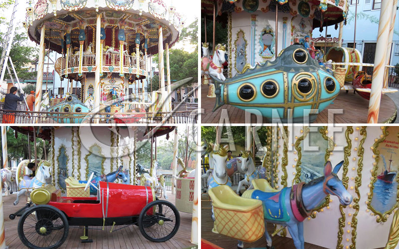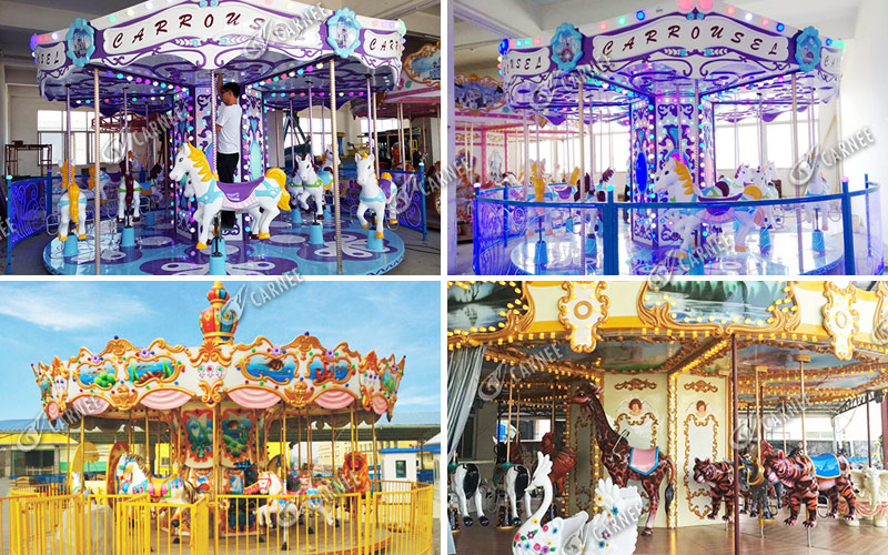 According to the theme, size, etc., the playground carousel sold in Carnee can be divided into: small carousel, antique/vintage carnival carousel, large carousel, double carousel, simple playground carousel, children's playground carousel , marine theme carousel and so on.