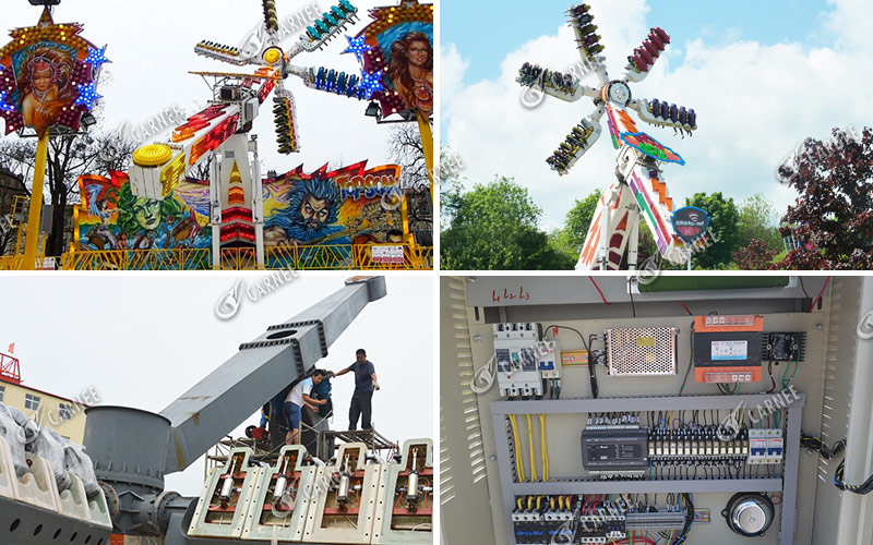 Speed windmill rides is one kind of the large-scale thrill amusement park machines which are given up-to-date idea and high technology. While Speed Windmill is working,the main column will be raised up slowly, and then it circles both in positive and negative revolution. Meanwhile the support arms also circles at a very high speed. Under this condition the center of gravity changes and the cabin begins tumbling freely and irregularly.